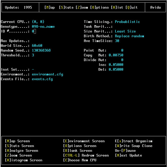 For the most part the text interface to Avida is simple and straightforward to use; most of the options available are listed on the screen. For example at all times there is a menu bar at the top of the screen which lists the current update and the keys to press to go to any of the most used Avida screens. These sections further explain each screen: